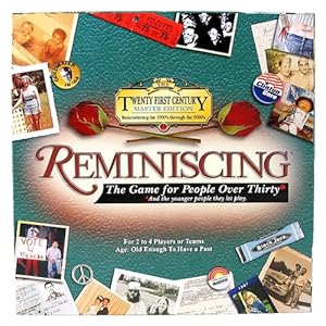 Reminiscing Game. Challenges your memory of events, fads, from 1950's- 2000s. Comes with 1296 nostalgia questions, 5184 clues, dice, gameboard.